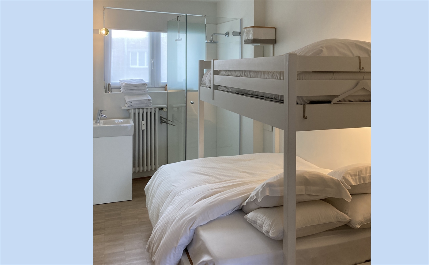 Dit stijlvolle en luxueuze appartement is gelegen op de vijfde verdieping van de Residentie Des Nations. De ruime en lichtrijke woonkamer biedt een adembenemend panoramisch uitzicht op zee en nodigt uit tot pure ontspanning. U beschikt over digitale televisie en wifi voor optimaal comfort tijdens uw verblijf.De moderne open keuken is volledig uitgerust en beschikt onder meer over een vaatwasser en een gasfornuis.Het appartement telt twee slaapkamers. De master bedroom biedt een prachtig zeezicht en is ingericht met een comfortabel tweepersoonsbed. Aansluitend bevindt zich een badkamer met ligbad en lavabo. De tweede slaapkamer is voorzien van een stapelbed, met onderaan een bed van 140 cm en bovenaan een bed van 90 cm, en beschikt over een eigen badkamer met douche en lavabo. Daarnaast is er een apart toilet.Een praktische berging vervolledigt dit aangename verblijf. Huisdieren en roken zijn niet toegestaan.